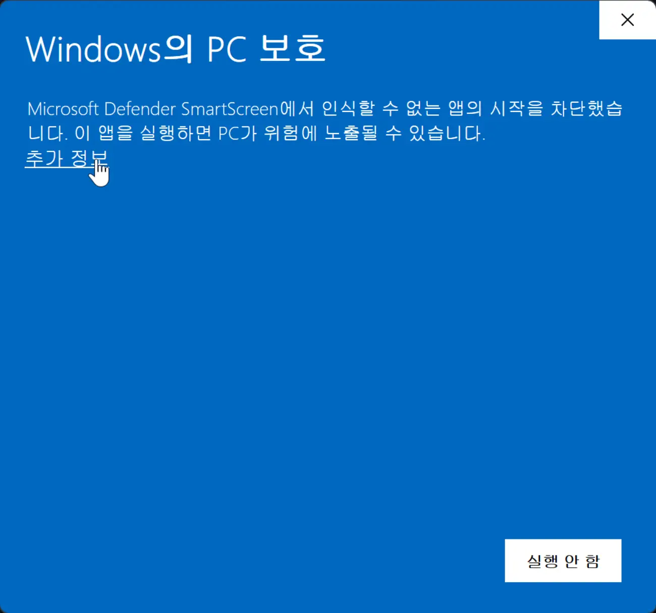 - 위와 같이 스마트스크린(SmartScreen) 경고창이 뜨는 경우도 있는데, '추가정보' 버튼을 누르면 실행이 가능합니다.