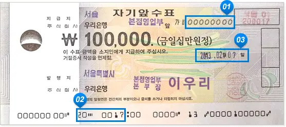 수표는 아래와 같이 ①수표번호, ②발행점 번호, ③수표 발행일 등의 정보가 적혀 있습니다.