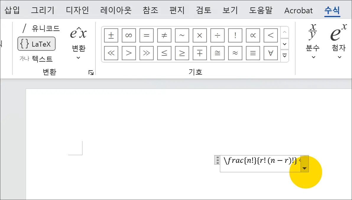 - 리본메뉴에서 {} LaTeX를 선택합니다.