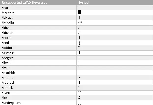 MS워드는 모든 LaTeX 문법을 지원하지는 않고 있습니다. 아래의 몇가지 문법은 지원되지 않습니다.