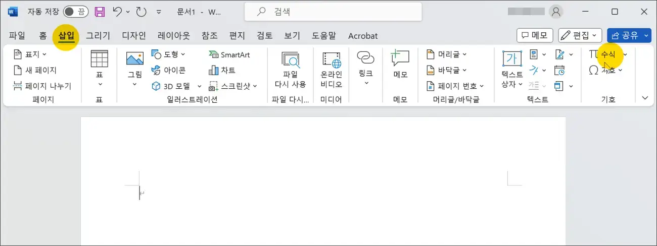 - MS워드를 싱행 후 상단의 메뉴에서 '삽입'을 선택하고, 우측에서 '수식'을 선택합니다.