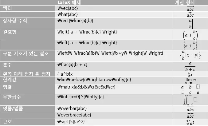 MS워드에서 LaTeX를 이용하여 수식을 입력하는 문법 예제는 아래를 참고하시기 바랍니다.