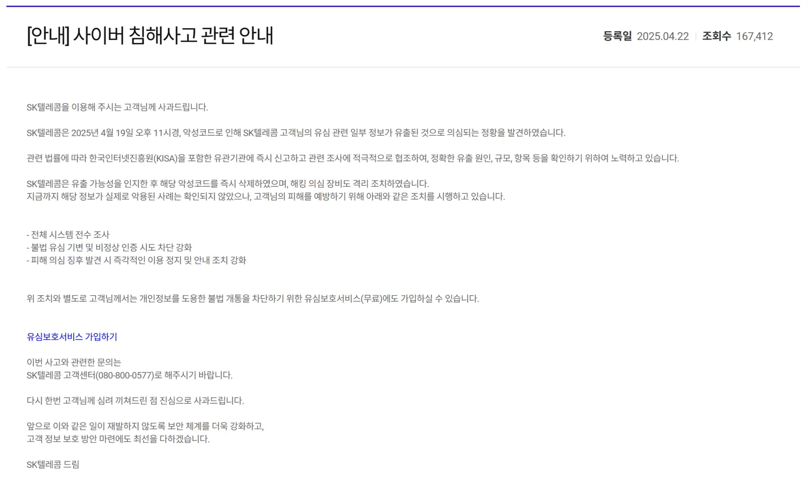 따라서 SK텔레콤 고객이라면 선제적으로 유심을 교체하여 정보 유출에 따른 위험을 사전에 차단하는 것이 좋습니다.