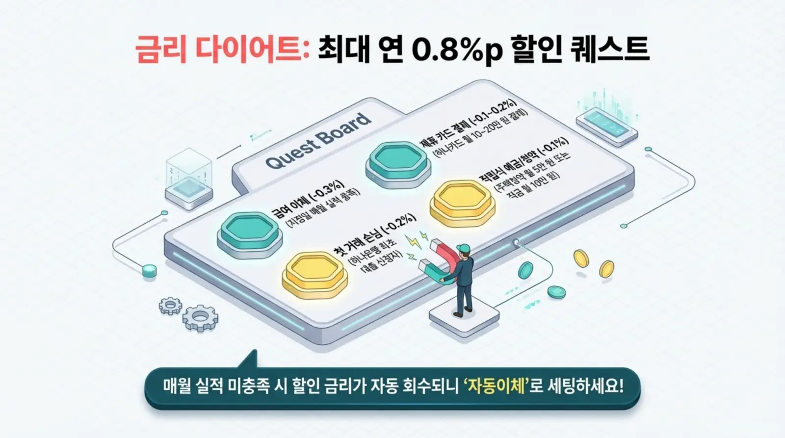 - ✅ 금리 우대: 급여이체+하나카드+청약통장으로 최대 1.0%p 할인