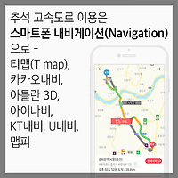 "추석 고속도로 이용은 스마트폰 내비게이션(Navigation)으로 - 티맵(T map), 카카오내비, 아틀란 3D, 아이나비, KT내비, U네비, 맵피" 막히는 고속도로에서는 차량용 내비게이션 보다 스마트폰 내비게이션이 유용할 수 있습니다. 별도로 업그레이드 받지 않아도, 실시간으로 교통상황에 맞춘 최적의 길안내를 해주기 때문입니다. 추석처럼 전국이 정체되는 상황이면 그다지 효과를 기대하기 힘들지도 모르겠네요.. T map for All T map은 1,800만 명이 사용하는 국내 1위 내비게이션으로, 1,800만 사용자가 만들어내는 1분 단위 "실시간 교통정보" 기반의 "최적 경로"와 내비게이션 기반의 "운전습관" 분석 기능을 제공합니다. 카카오내비국민내비 김기사가 3.0버전 업데이트와 함께 카카오내..